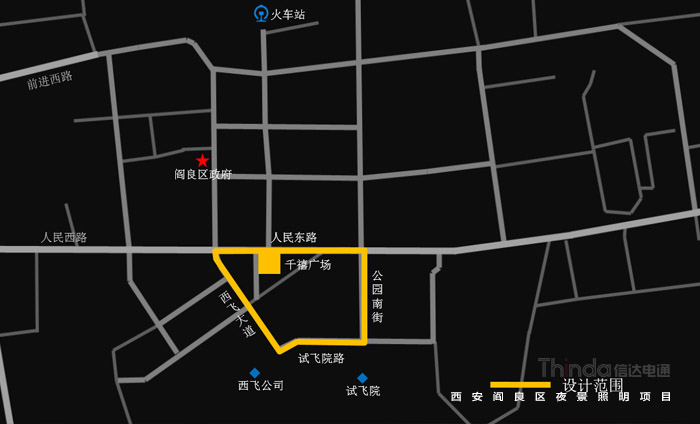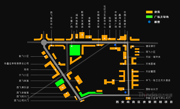 閻良區(qū)位于西安東北部,不但是一座底蘊深厚的歷史古城,還是一座資源豐富的航空名城,區(qū)內(nèi)有中航工業(yè)試飛中心、第一飛機設(shè)計研究院、西飛公司、中國飛機強度研究所等大型航空企事業(yè)單位,聚集了1/3以上的航空資源。閻良已成為中國唯一、亞洲最大的六位一體的航空工業(yè)基地,被譽為“中國航空城”。本案亮化設(shè)計范圍為閻良區(qū)人民東路、西飛大道、試飛院路、公園南街等四條道路兩側(cè)的30余棟建筑及廣場、景觀帶。