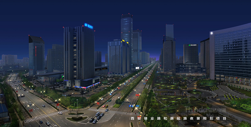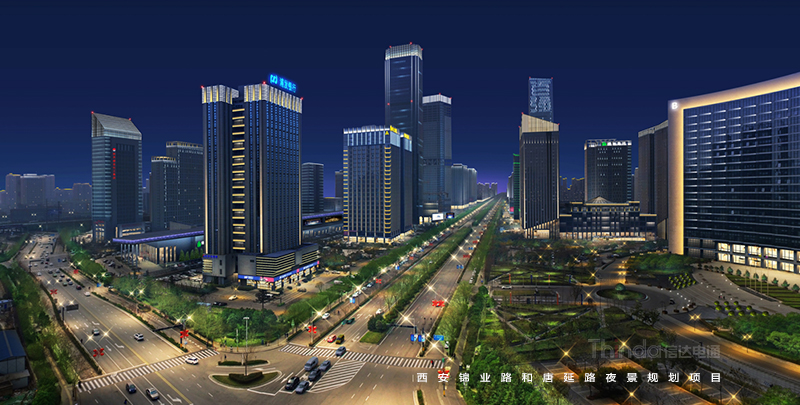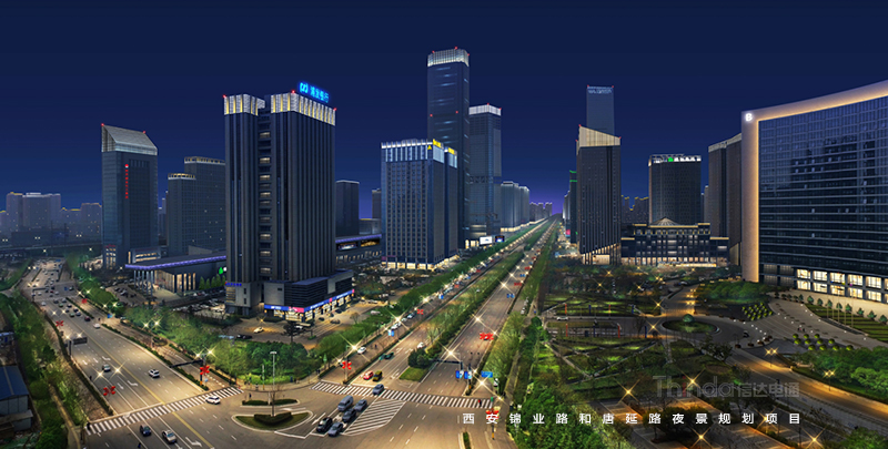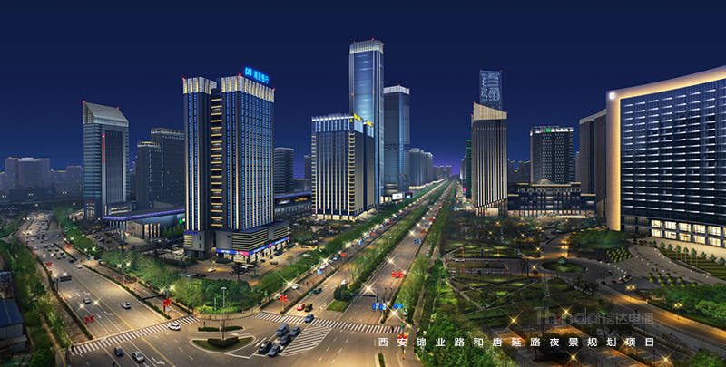 本項(xiàng)為西安高新區(qū)建筑景觀照明規(guī)劃設(shè)計(jì)中的一部分,地處于唐延路南與錦業(yè)路東交叉口,該視角可見建筑有都市之門、浦發(fā)銀行、綠地智海大廈、綠地筆克國際會(huì)展中心、陜西煤業(yè)化工集團(tuán)、領(lǐng)海大廈、中鐵航空港假日酒店等,是高新區(qū)錦業(yè)路南端的重要位置,當(dāng)車輛、行人抵達(dá)該位置時(shí),視角寬闊夜晚可視范圍大,夜幕下的燈光也就更為重要。