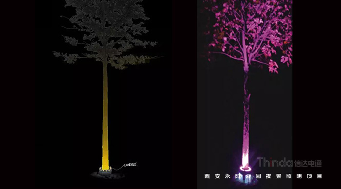 對于茂盛的樹木,建議從外部進行面光照射,勾勒出樹木的形狀也強調了其質感。草坪燈和投光相結合的燈具,既滿足道路照明又能將樹木打亮;
