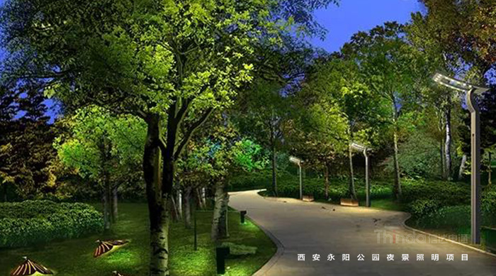 永陽公園的亮化使用綠色智控系統。燈光材料的選擇是根據被照物的具體情況選用低耗能的LED、EL光源和用紫外線照射發光的熒光涂料做裝飾照明。