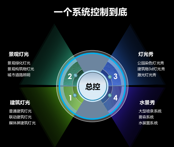 本項(xiàng)目采用“鼎立慧聯(lián)”智慧照明云服務(wù)平臺(tái),通過(guò)云控制器的核心管理,景觀燈光、燈光秀、建筑燈光、水景秀實(shí)現(xiàn)了單一系統(tǒng)遠(yuǎn)程控制、場(chǎng)景控制和數(shù)據(jù)監(jiān)控。