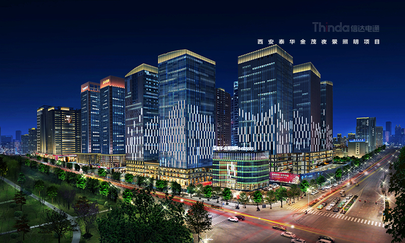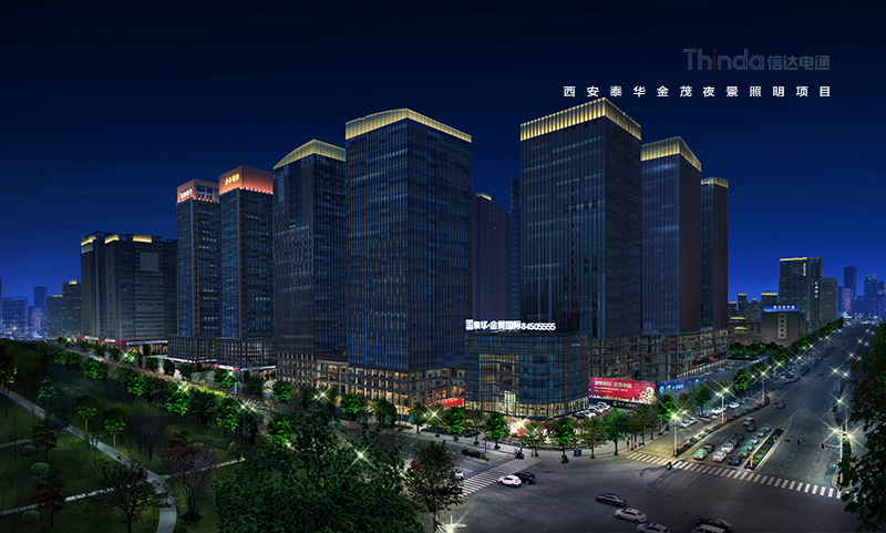 泰華·金貿國際位于西安高新區金融圈與商務圈的交匯地帶,與唐城墻遺址公園僅一路之隔。有西安首創山水云陶筑玻璃幕墻,高端商務會所,啟封現代商務的新風范。信達根據辦公樓的戶外亮化照明設計要素和泰華·金貿國際建筑景觀特點以及所處的地理位置,對泰華·金貿國際進行戶外亮化照明設計改造工作。改變了泰華·金貿國際之前的色系昏暗現狀,增加了建筑的外立面整體效果及廣告照明的效果,洗亮泰華·金貿國際建筑頂部,凸顯天際效果,使泰華·金貿國際成為西安夜色下一道亮麗的風景。